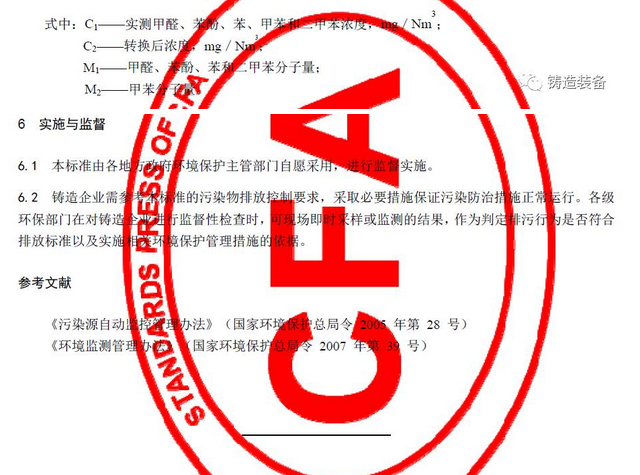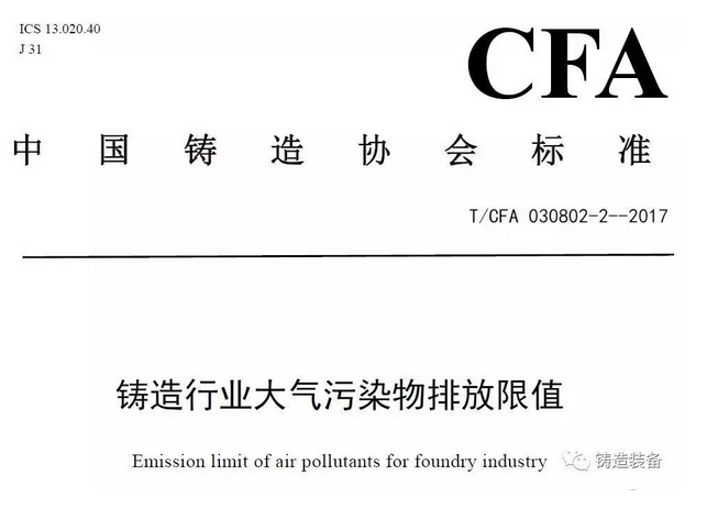 2017年7月31日,由中國鑄造協(xié)會發(fā)布的T/CFA030802-2—2017《鑄造行業(yè)大氣污染物排放限值》(中國鑄造協(xié)會標(biāo)準(zhǔn)公告 2017年 第06號)發(fā)布。該標(biāo)準(zhǔn)于2017年10月1日起實(shí)施。
