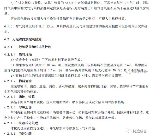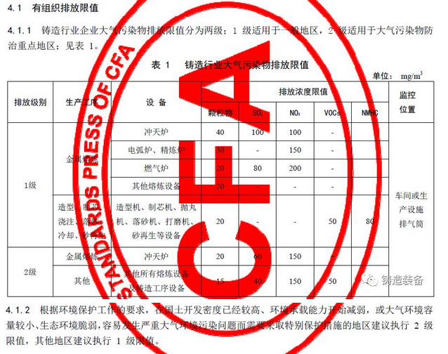 現(xiàn)摘錄T/CFA030802-2—2017中“4排放控制要求”、“5污染物監(jiān)測要求”、“6實(shí)施與監(jiān)督”部分。前三部分“1范圍、2規(guī)范性引用文件、3術(shù)語與定義”請自行登錄中國鑄造協(xié)會網(wǎng)站查閱。
