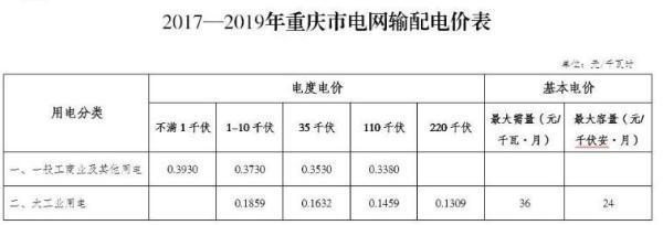 重慶電網2017—2019年分電壓等級輸配電價詳見附表。國網重慶市電力公司執行此輸配電價標準。